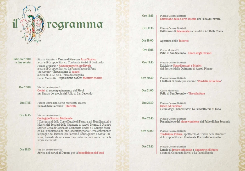 Tra queste, per la prima volta oltre 100 giovani Pergolesi daranno vita alla contesa del Palio di San Secondo con il Gioco degli Stracci, Fune e Stafferra. Passione, identità, partecipazione: gli ingredienti di un appuntamento che saprà coinvolgere tutta la comunità.
